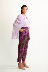 Front pleated cotton pants with structured waistband, side seam pockets and purple contrast piping