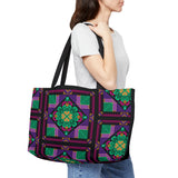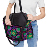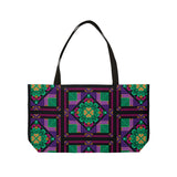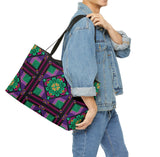 The Bag: Vibrant custom print on soft black canvas. Spacious - lightweight handbag, holds a generous amount of personal items making it suitable for an every day and travel carry on, inspired by Palestinian embroidery and heritage.