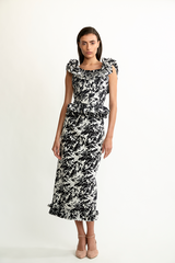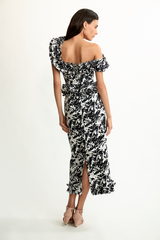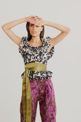 On or off the shoulder fitted scoop neck ruffle bodice with layered peplum. Multi ruffled shoulder straps that beautifully frame the shoulders and neckline bringing attention to the collar bone and face. Wear this romantic bodice with its matching skirt to create a cocktail dress style that suits multiple summer occasions or pair it with a pair of pants for a more casual yet festive look. Available in batik cotton prints or jewel tone solids.